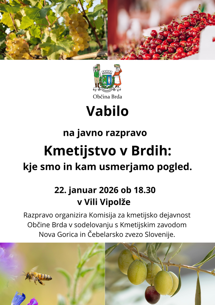 Nazaj Za občane/Dogodki Javna razprava o kmetijstvu v Brdih 22.01.2026 - 22.01.2026 / 18:30 / Vila Vipolže Več na povezavi.